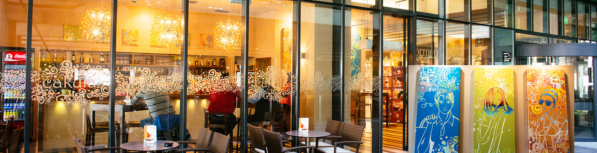 I started this project with a picture of three content customers, who are chatting in a nice andelegant bar after shopping. Later on, at the request of the owners, I also designed other decorations, glass panning (for greater intimacy of conversations), big bar boards, a Smothie corner and more ...